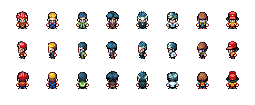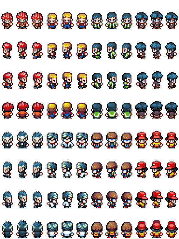 This is a full collection of new character sprites in a modern-chibi-pokémon style, with four-directional walk animations.